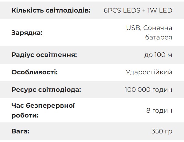 Завдяки 6 світлодіодам, радіус освітлення ліхтаря досягає до 100 м. За допомогою порту USB ви можете без проблем зарядити свій гаджет, чи то мобільний телефон, чи планшет. Ви можете не переживати, що ваш ліхтар швидко розрядиться і вам доведеться шукати додаткове джерело живлення – завдяки сонячній батареї, ліхтар буде завжди заряджений. Його легка вага (всього 350 г) і невеликий розмір є одними з основних переваг, а завдяки ударостійкому пластику, ви можете не переживати, що при падінні ліхтар зашкодить.