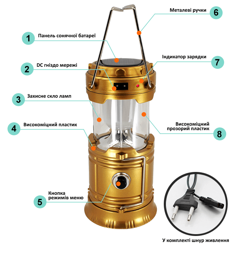 Світлодіодна лампа – це кемпінговий ліхтар, який може виконувати роль лампи і зарядки. Лампа пристрою дозволяє освітлювати навколишній простір м’яким білим світлом.